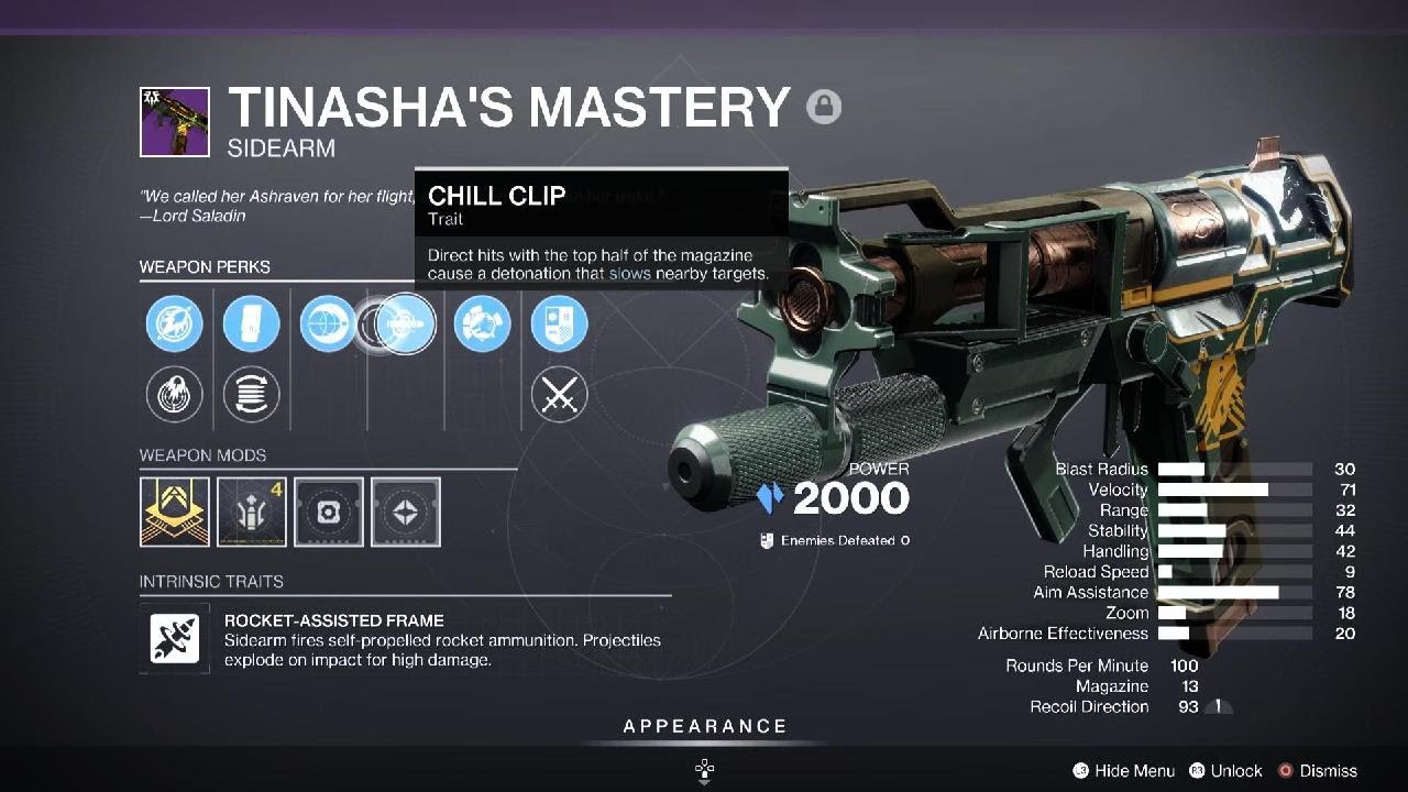 | What Makes it a Meta Weapon? | Tinasha’s Mastery is the first Stasis rocket sidearm. It is a top-tier choice for PvE because it can slow and freeze enemies while dealing explosive damage.